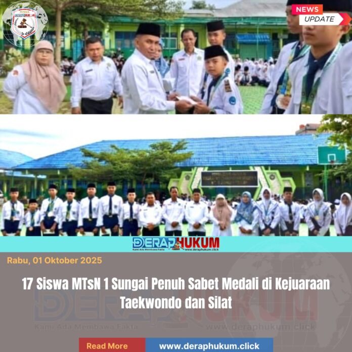 Sungai Penuh, | Deraphukum.click | Madrasah Tsanawiyah (MTs) Negeri 1 Kota Sungai Penuh kembali menorehkan prestasi membanggakan. Sebanyak 17 siswa berhasil meraih medali dalam ajang Kejuaraan Taekwondo Mendagri Cup, Jambi Championship, dan Kejuaraan Silat Tingkat Provinsi Jambi.