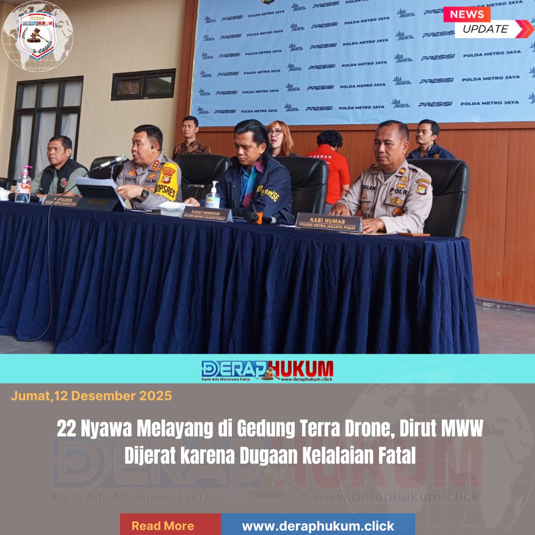 Jakarta, | Deraphukum.click | Kepolisian menetapkan Direktur Utama PT Terra Drone Indonesia, Michael Wisnu Wardhana (MWW), sebagai tersangka dalam kasus kebakaran maut di gedung Terra Drone, Kemayoran, Jakarta Pusat, yang menewaskan 22 orang. Penetapan tersangka diumumkan Kapolres Metro Jakarta Pusat Kombes Susatyo Purnomo Condro dalam konferensi pers di Mapolres Metro Jakarta Pusat, Jumat (12/12/2025).