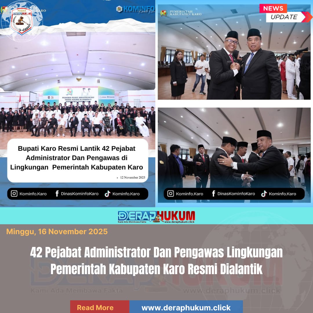 Pemerintah Kabupaten (Pemkab) Karo melalui Bupati Karo, Brigjen Pol (Purn) Dr. dr. Antonius Ginting, Sp.OG., M.Kes resmi melantik 42 Pejabat Administrator dan Pejabat Pengawas di lingkungan Pemerintah Kabupaten Karo, bertempat di Aula Kantor Bupati Karo, Rabu (12/11/2025).