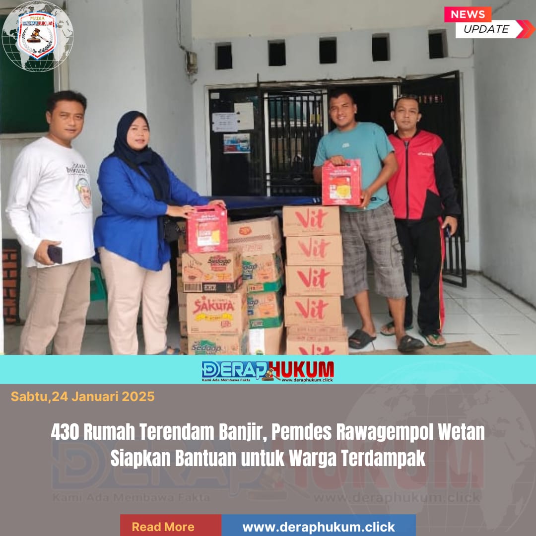 Karawang,Jawa Barat | Deraphukum.click | Sabtu, 24 Januari 2026 Pemerintah Desa Rawagempol Wetan bergerak cepat menyikapi bencana banjir yang melanda wilayahnya. Kepala Desa Rawagempol Wetan, H. Udin AG, didampingi Sekretaris Desa Ibu Melan, Wakil Darsim, para Ketua RW, Fifit, Wakil Nata, serta unsur Karang Taruna Rawet, melaksanakan kegiatan persiapan penyaluran bantuan bagi warga yang rumahnya terdampak banjir.