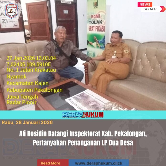 Kajen, Jawa Tengah | Deraphukum.click I Komitmen pengawasan terhadap jalannya pemerintahan daerah kembali ditunjukkan oleh Ali Rosidin, aktivis yang juga Ketua LBH Brajamusti Nusantara Pekalongan pada Selasa sore (27/1), mendatangi Kantor Dinas Inspektorat Kabupaten Pekalongan untuk meminta kejelasan terkait sejumlah persoalan yang terjadi di lingkungan pemerintahan desa Kabupaten Pekalongan.