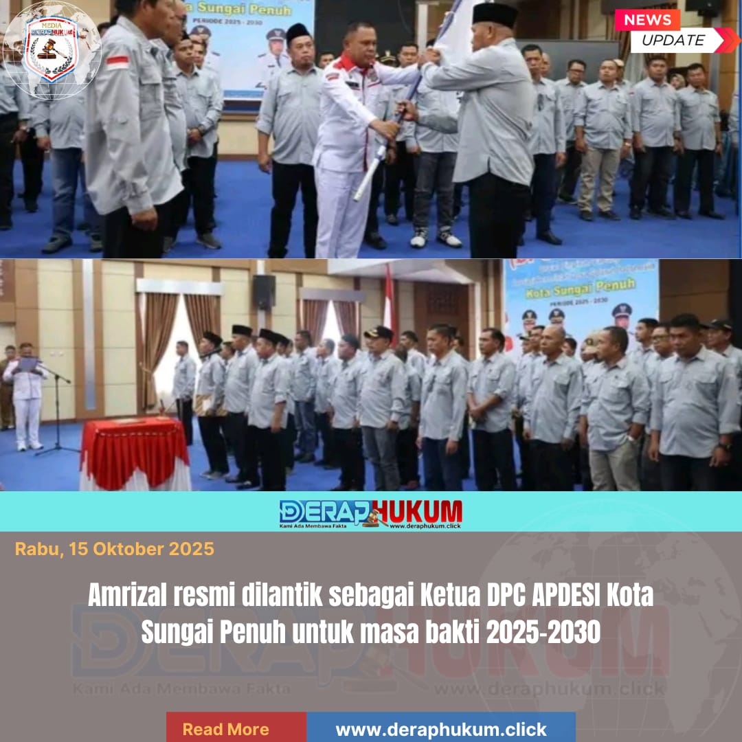 Sungai Penuh – Di tengah upaya memperkuat pemerintahan desa yang tangguh dan profesional, Amrizal resmi dilantik sebagai Ketua Dewan Pimpinan Cabang (DPC) Asosiasi Pemerintah Desa Seluruh Indonesia (APDESI) Kota Sungai Penuh untuk masa bakti 2025–2030. Pelantikan digelar pada Senin (14/10/2025) di Aula Pemerintah Kota Sungai Penuh, disaksikan oleh para pemangku kepentingan daerah.