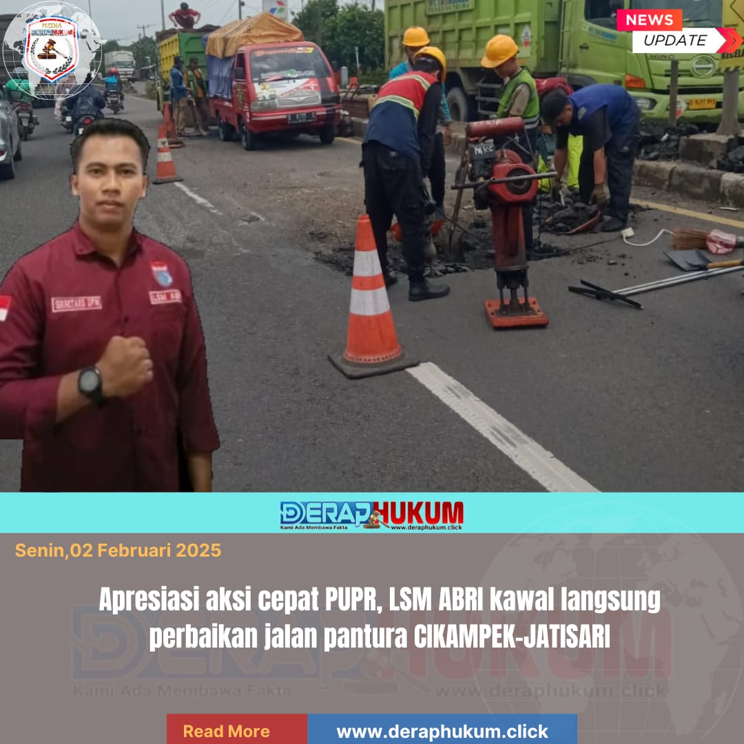 Karawang,Jawa Barat | Deraphukum.click | Sekretaris DPW LSM ABRI (Abdi Lestari), Dennis A. Firdaus, S.Kom, turun langsung ke lapangan meninjau proses perbaikan Jalan Raya Pantura Cikampek–Jatisari, salah satu urat nadi transportasi nasional yang selama ini dikeluhkan masyarakat akibat kerusakan dan membahayakan pengguna jalan.