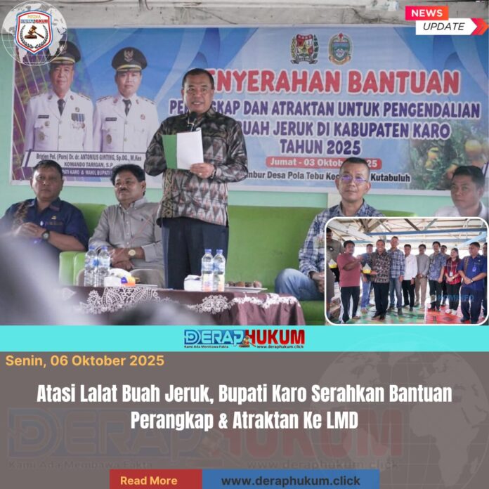 Bupati Karo, Brigjen Pol (Purn) Dr. dr. Antonius Ginting, Sp.OG., M.Kes., menyerahkan bantuan perangkap dan atraktan hama lalat buah Jeruk kepada Kelompok Tani di Kawasan Liang Melas Datas (LMD), Jumat (03/10/2025).