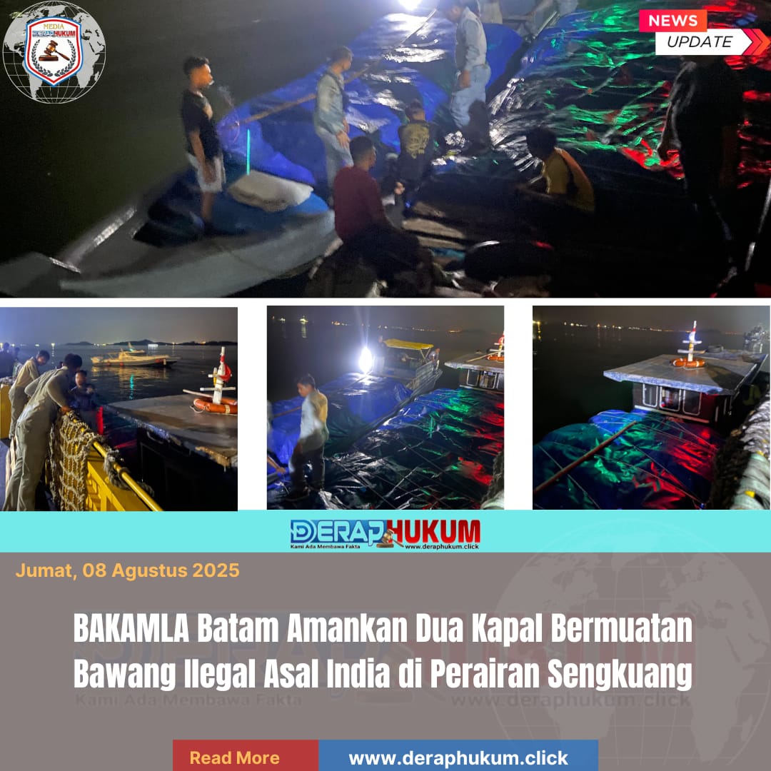 Batam, | Deraphukum.click | Badan Keamanan Laut (BAKAMLA) Batam kembali menindak tegas aktivitas penyelundupan di wilayah perairan Kepulauan Riau. Kamis malam Jum’at (07/08/2025) sekitar pukul 21.30 WIB, dua kapal bermuatan bawang impor asal India berhasil diamankan di perairan Sengkuang, Batam.