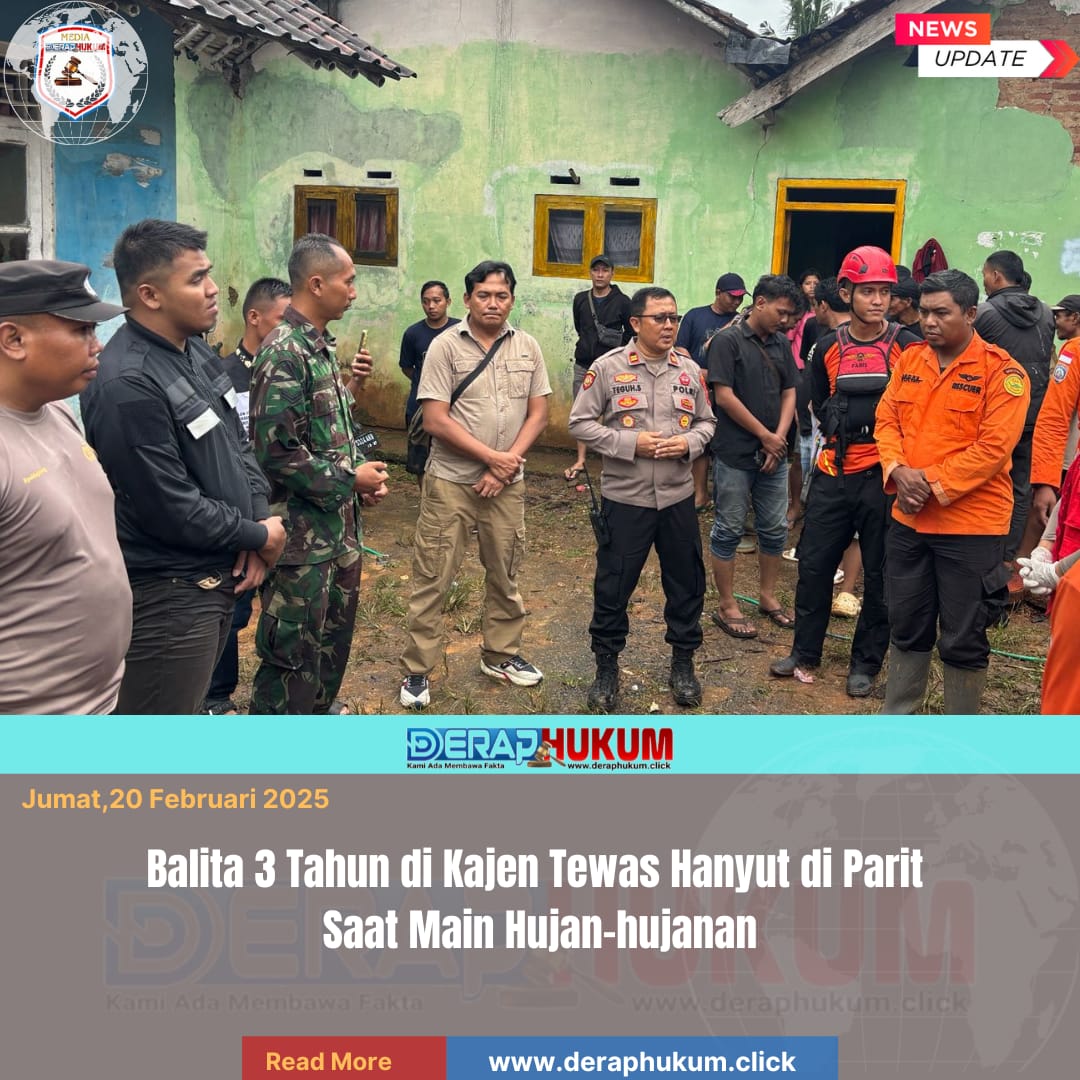 Pekalongan,Jawa Tengah | Deraphukum.click | Polres Pekalongan – Polda Jateng – Duka mendalam menyelimuti Desa Tambakroto, Kecamatan Kajen, Kabupaten Pekalongan. Seorang balita laki-laki bernama MG (3) ditemukan dalam kondisi meninggal dunia setelah hanyut terbawa arus parit saat bermain hujan-hujanan, Kamis (19/02/2026).