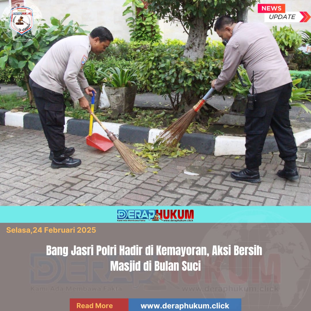 Jakarta Pusat, | Deraphukum.click | Kepolisian melalui program Bang Jasri (Bhayangkara Jakarta Asri) kembali menunjukkan kepedulian sosial dengan hadir langsung di tengah masyarakat. Jajaran Polsek Kemayoran bersama Polres Metro Jakarta Pusat melaksanakan aksi bersih-bersih masjid di wilayah Kemayoran, Jakarta Pusat, Senin (23/2/2026).