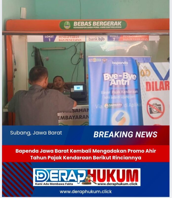 SUBANG | Deraphukum.click | Badan Pendapatan Daerah (Bapenda) Jawa Barat kembali mengadakan Promo Akhir Tahun 2024 Pajak Kendaraan. Program ini berlangsung dari 1 hingga 23 Desember 2024, memberikan berbagai kemudahan dan relaksasi pajak kendaraan kepada masyarakat Jawa Barat.