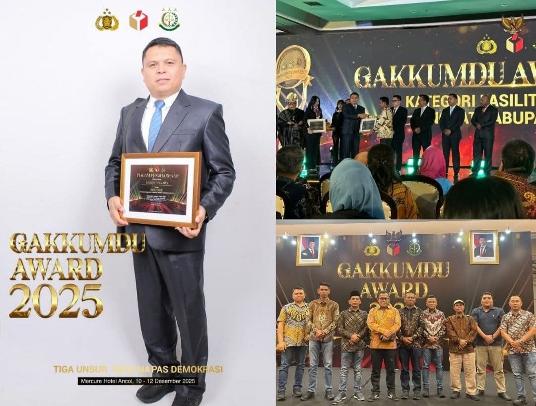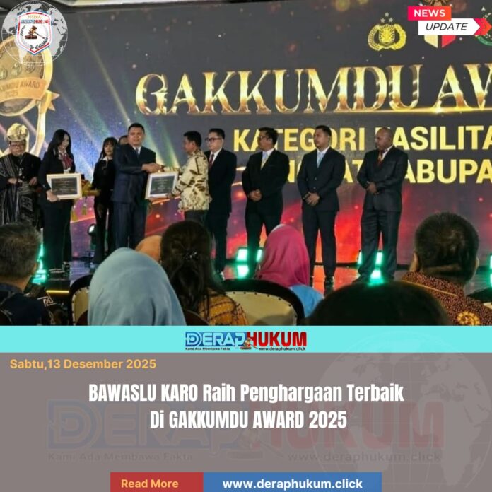 Sentra GAKKUMDU (Penegakan Hukum Ganti Kerugian Negara) BAWASLU KARO raih penghargaan pada nominasi Sentra GAKKUMDU dengan fasilitasi terbaik di ajang GAKKUMDU Award Tahun 2025. Penghargaan tersebut diterima langsung oleh Kordinator Divisi Penanganan Pelanggaran dan Penyelesaian Sengketa Bawaslu Karo di Hotel Mercure Convention Center Ancol, Jakarta Utara, Kamis (11/12/2025) malam.