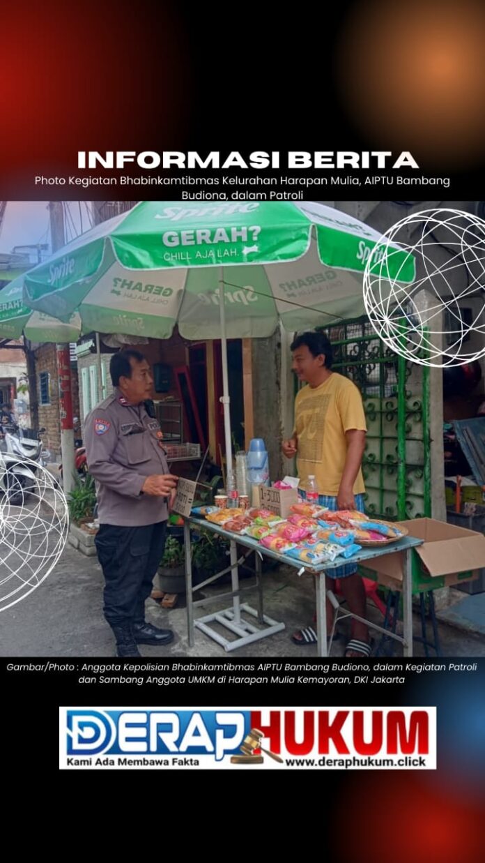 JAKARTA PUSAT | Deraphukum.click | Bhabinkamtibmas Kelurahan Harapan Mulia Aiptu Bambang Budiyono melaksanakan kegiatan Patroli dan Sambang Anggota UMKM di Wilayah Rt.002 Rw.001 Kelurahan Harapan Mulia Kemayoran Jakarta Pusat. Sabtu (09/11/2024).