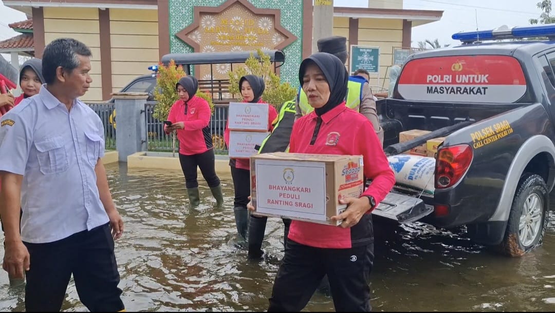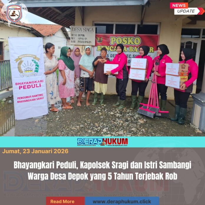 PEKALONGAN, Jawa Tengah | DerapHukum.click | Polres Pekalongan – Polda Jateng – Kepedulian terhadap warga terdampak banjir rob ditunjukkan oleh jajaran Polsek Sragi. Kapolsek Sragi AKP Turkhan, S.H. bersama Ketua Bhayangkari Ranting Sragi Ny. Yani Turkhan, mengunjungi warga Desa Depok, Kecamatan Siwalan, Kabupaten Pekalongan yang pemukimannya terus digenangi air laut pasang, Rabu (21/01/2026).