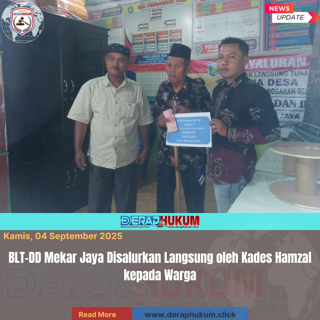 Sungai Penuh, Jambi | DerapHukum.click | Pemerintah Desa Mekar Jaya, Kecamatan Tanah Kampung, menyalurkan Bantuan Langsung Tunai Dana Desa (BLT-DD) untuk periode Juli–Agustus 2025 pada Kamis (3/9/2025). Penyaluran bantuan berlangsung di kantor desa setempat.