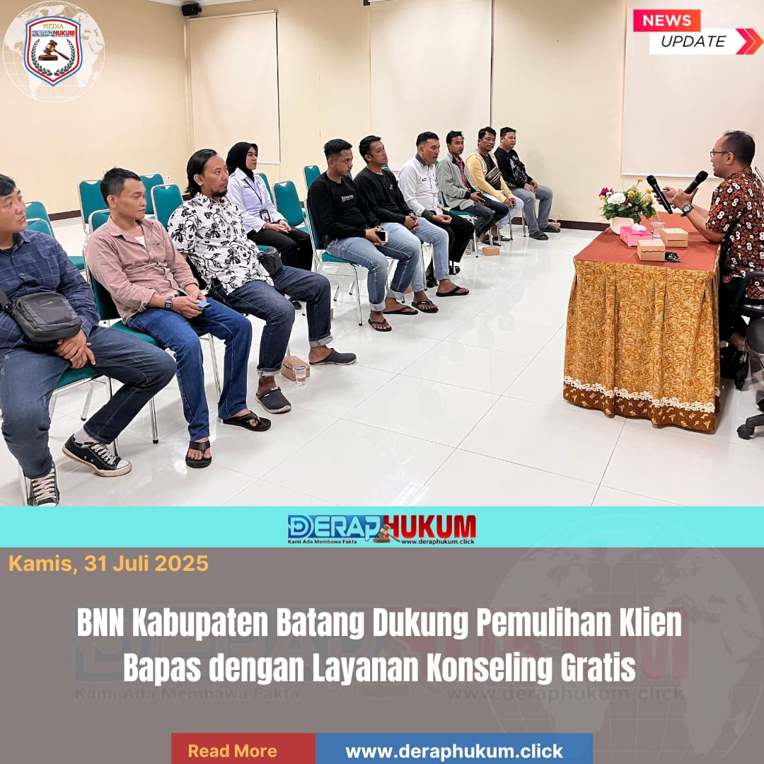 Pekalongan,Jawa Tengah | Deraphukum.click | ,31 Juli 2025 – Badan Narkotika Nasional (BNN) Kabupaten Batang hari ini mengadakan kegiatan pembimbingan kepribadian bagi 10 klien Balai Pemasyarakatan (Bapas) Kelas II Pekalongan. Bertempat di Pusdiklat Kospin Jasa, kegiatan ini bertujuan membekali para klien, khususnya yang terlibat kasus narkotika, dengan pemahaman mendalam mengenai pentingnya penerimaan diri dan perubahan perilaku positif.