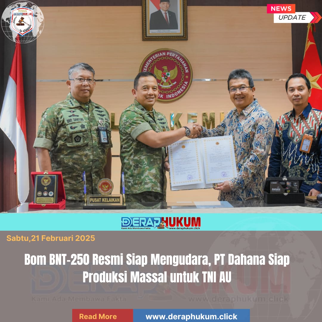Subang,Jawa Barat l Deraphukum.click l PT Dahana menerima penyerahan Design Approval Type Certificate (TC) Bomb BNT-250 serta Sertifikat Defence Production Facility dari Pusat Kelaikan Kementerian Pertahanan(Puslaik Kemhan). Penyerahan dilaksanakan di kantor Puslaik Kemhan pada Jumat (20/2/2026).