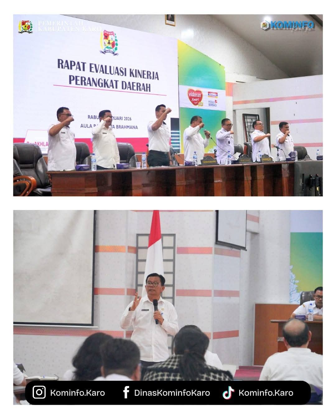 Pemerintah Kabupaten (Pemkab) Karo dalam hal ini selaku Bupati Karo, Brigjen Pol (Purn) Dr. dr. Antonius Ginting, Sp.OG., M.Kes., didampingi Wakil Bupati Karo, Komando Tarigan, SP., Sekretaris Daerah Kabupaten Karo, Gelora Kurnia Putra Ginting, S.STP., MM., Para Asisten, serta Inspektur Kab.Karo memimpin Rapat Evaluasi Kinerja Perangkat Daerah yang dilaksanakan di Aula Rakoetta Brahmana (Aula Kantor Bupati Karo), pada Rabu (04/02/2026) serta dihadiri oleh Para Kepala OPD dan Para Camat se-Kabupaten Karo.