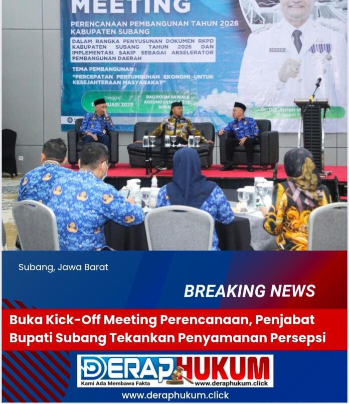 SUBANG | Deraphukum.click | – Penjabat Bupati Subang, Dr. Drs. Imran, M.Si., MA.Cd, secara langsung membuka Kick-Off Meeting Perencanaan Pembangunan Tahun 2026 Kabupaten Subang yang berlangsung di Laska Hotel Subang, Jumat (17/01/2025).