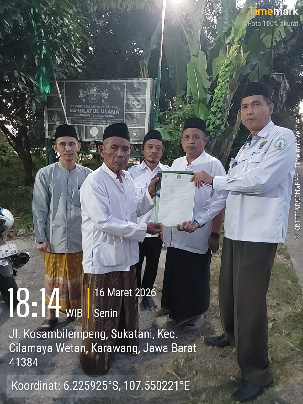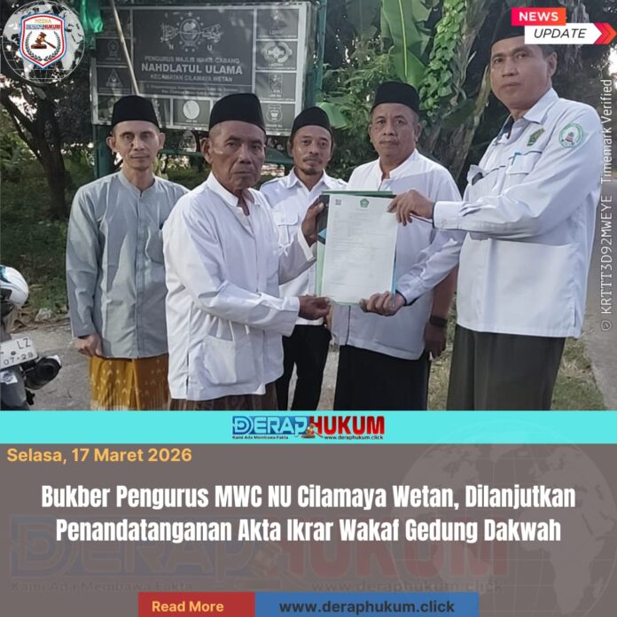 Sementara itu, Ketua Majelis Wakil Cabang Nahdlatul Ulama Cilamaya Wetan, Nanang Fahrudin ZA, S.H.I., menerima wakaf tersebut sebagai nazhir atas nama lembaga.