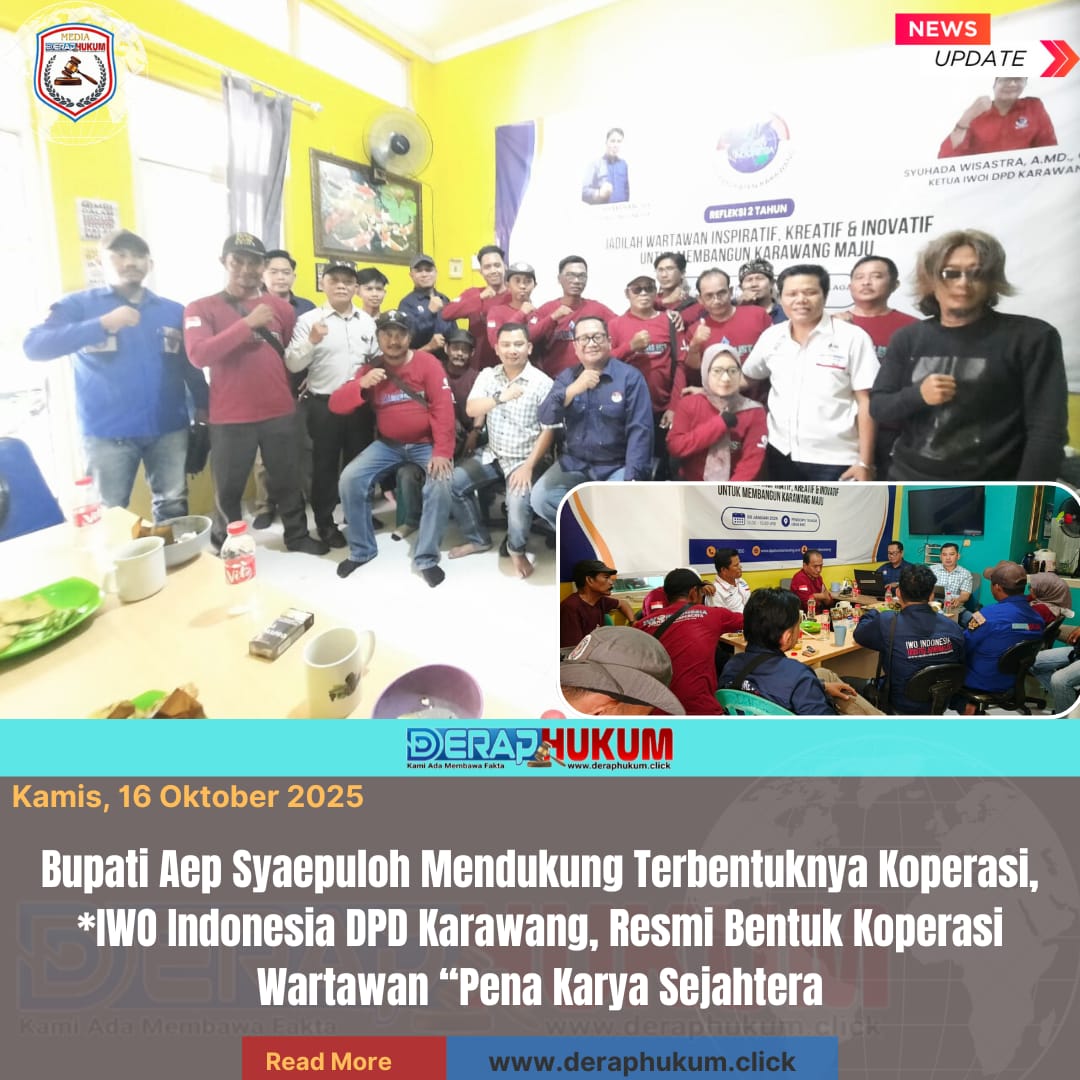 | Deraphukum.click | Ikatan Wartawan Online Indonesia (IWO Indonesia) Dewan Pimpinan Daerah (DPD) Karawang resmi membentuk Koperasi Wartawan IWO Indonesia DPD Karawang “Pena Karya Sejahtera”, dalam rapat yang digelar pada hari Rabu, (15/10/2025), di Sekretariat IWOI Karawang, Perum Jasmine Village Melbourne Cluster A11 Karawang, yang di hadiri oleh para pengurus IWOI dan perwakilan dari setiap koordinator wilayah.
