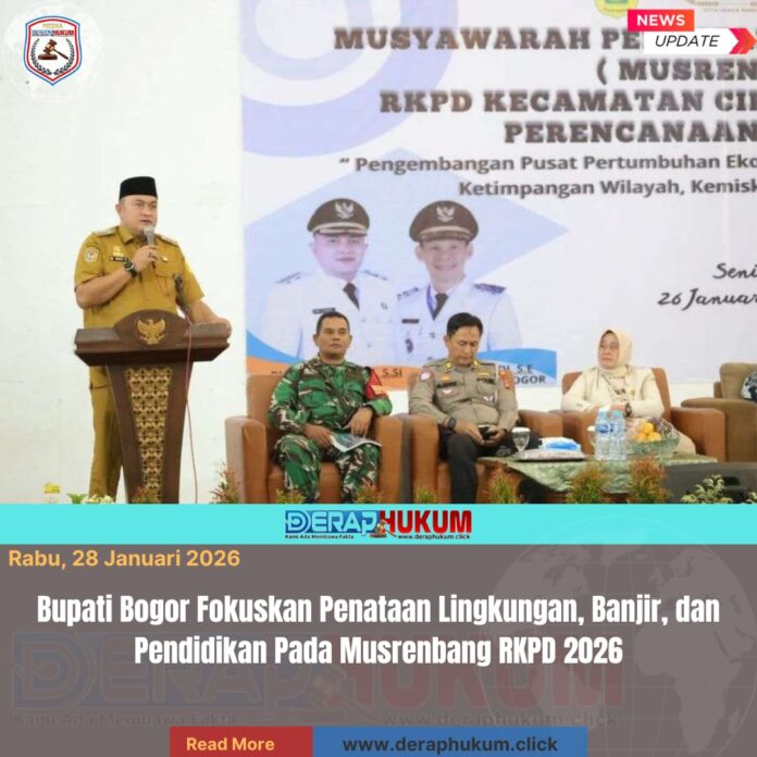 KAB. BOGOR, Jawa Barat | Deraphukum.click | Bupati Bogor Rudy Susmanto memfokuskan penataan lingkungan, pengendalian banjir, dan layanan pendidikan di Kecamatan Cibinong melalui Musyawarah Perencanaan Pembangunan Rencana Kerja Pemerintah Daerah Tahun 2026 pada (26/1/2026) sebagai solusi langsung bagi kebutuhan warga.