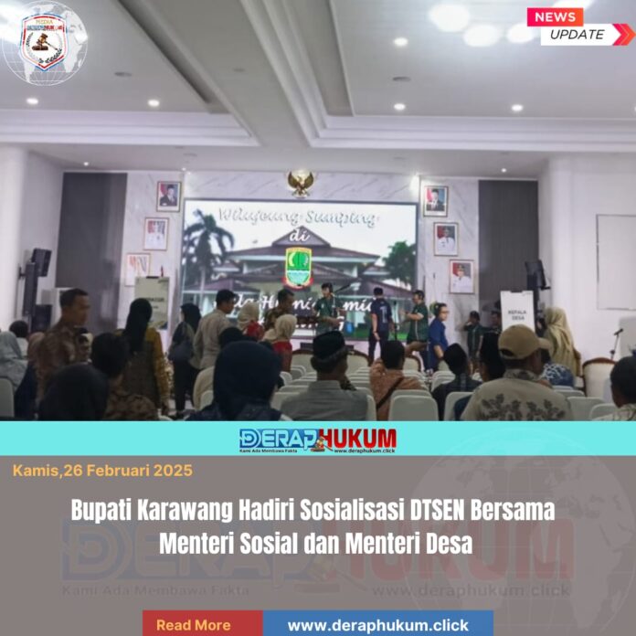 Karawang,Jawa Barat | Deraphukum.click | Kamis 26 Februari 2026 – Pemerintah Kabupaten Karawang menggelar kegiatan sosialisasi DTSEN yang dihadiri langsung oleh Aep Syaepuloh selaku Bupati Karawang, bersama Saifullah Yusuf dan Yandri Susanto. Kegiatan ini berlangsung di wilayah Kabupaten Karawang dan menjadi momentum penting dalam memperkuat sinergi antara pemerintah pusat dan daerah.