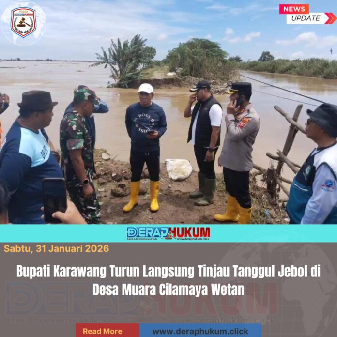 Karawang, Jawa Barat | Deraphukum.click | Bupati Karawang, H. Aep Syaepuloh, S.E., turun langsung ke lokasi tanggul jebol di Desa Muara, Kecamatan Cilamaya Wetan kabupaten karawang,untuk melihat secara langsung kondisi kerusakan yang menyebabkan banjir dan mengancam pemukiman warga, Jumat 31 Januari 2026.