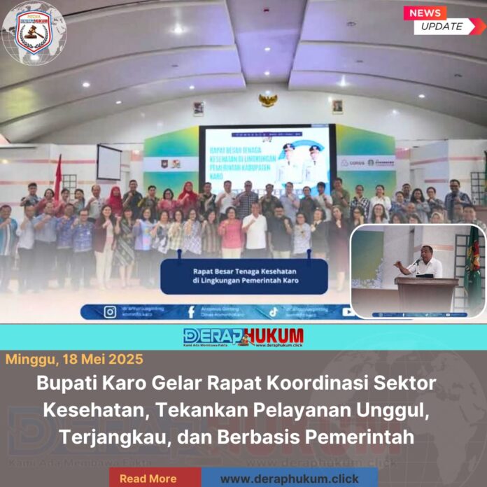 PKabanjahe, KARO, Sumatra Utara | Deraphukum.click | Bupati Karo, Brigjen Pol (Purn.) Dr. dr. Antonius Ginting, Sp.OG., M.Kes., memimpin langsung rapat strategis bersama jajaran Dinas Kesehatan, Direktur RSUD, kepala puskesmas, serta para dokter spesialis di Aula Kantor Bupati Karo, Sabtu (17/5/2025). Pertemuan ini merupakan langkah konkret Pemerintah Kabupaten Karo dalam mewujudkan pelayanan kesehatan yang unggul, mudah diakses, dan dikelola secara bertanggung jawab oleh pemerintah daerah, sejalan dengan visi “Karo Beriman, Karo Berbudaya, Karo Modern, Karo Unggul Menuju Kabupaten Karo Sejahtera Berkelanjutan.”