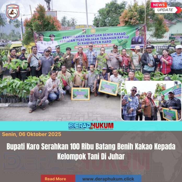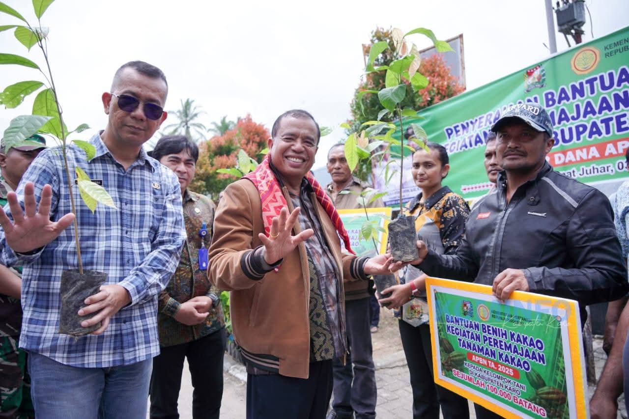 Bupati Karo, Brigjen Pol (Purn) Dr. dr. Antonius Ginting, Sp.OG., M.Kes., menyerahkan secara simbolis bantuan benih Kakao kepada kelompok Tani penerima di Kabupaten Karo, Jumat (03/10/2025).