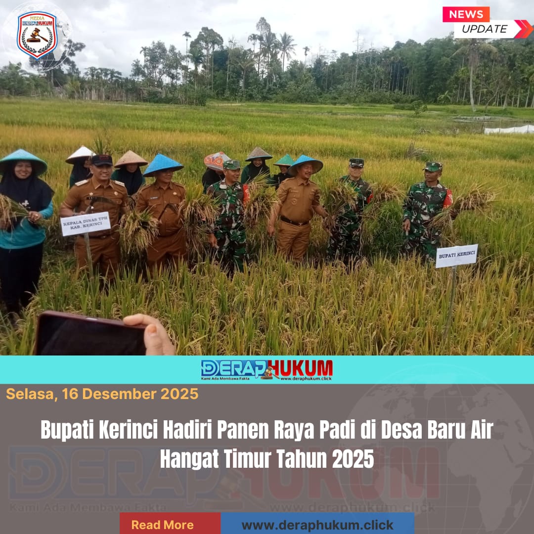 KERINCI, Jambi | DerapHukum.click | Bupati Kerinci, Monadi, menghadiri kegiatan Panen Raya Padi yang digelar di Desa Baru Air Hangat, Kecamatan Air Hangat Timur, Kabupaten Kerinci, pada Senin (15/12/2025). Kegiatan ini merupakan bagian dari program panen dan tanam padi yang dilaksanakan sepanjang tahun 2025.