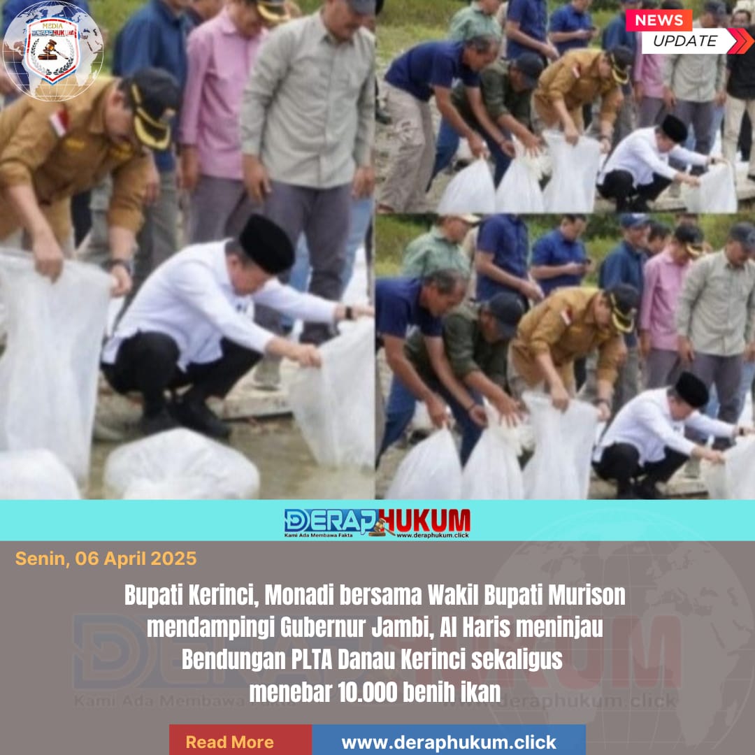 Bupati Kerinci, Monadi bersama Wakil Bupati Murison mendampingi Gubernur Jambi, Al Haris meninjau Bendungan PLTA Danau Kerinci sekaligus menebar 10.000 benih ikan