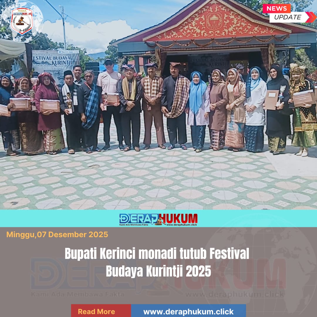 Kerinci, | Deraphukum.click | Seperti tirai yang perlahan menutup panggung selepas gemuruh tepuk tangan, Festival Budaya Kerinci 2025 resmi berakhir, Sabtu (6/12/2025). Penutupan dilakukan langsung oleh Bupati Kerinci, Monadi, didampingi Wakil Bupati H. Murison, di kawasan ikonik Dermaga Danau Kerinci. Ajang bertema “Balik Ku Dahin” itu menjadi momentum penting untuk mempertegas arah penguatan pariwisata dan identitas budaya daerah.