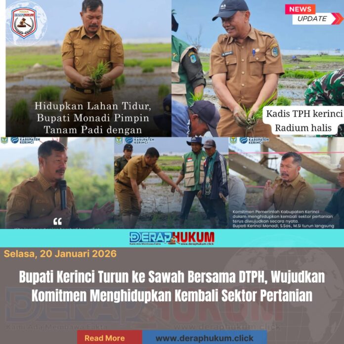 Kerinci, Jambi | DerapHukum.click | Komitmen Pemerintah Kabupaten Kerinci dalam menghidupkan kembali sektor pertanian terus diwujudkan secara nyata. Bupati Kerinci, Monadi, S.Sos., M.Si., turun langsung ke sawah memimpin kegiatan tanam padi varietas Ciherang dengan metode System of Rice Intensification (SRI) dan Jajar Legowo bersama masyarakat yang tergabung dalam Gapoktan Jaya Bersama di Desa Pendung Talang Genting, Kecamatan Danau Kerinci, Selasa (20/1/2026).