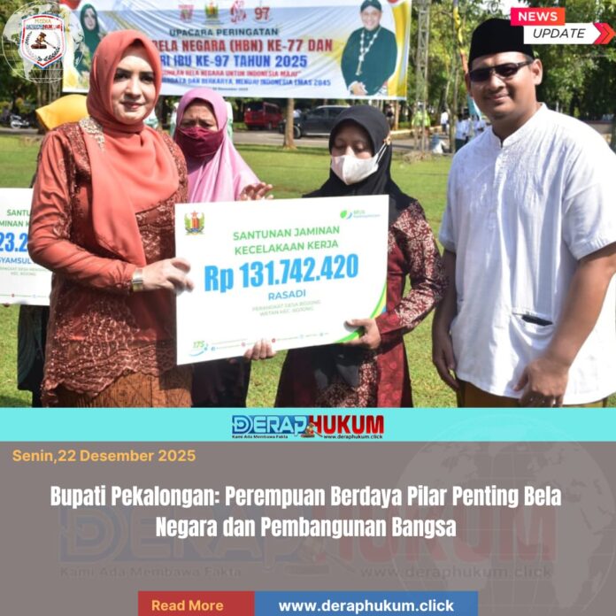 KAJEN, | Deraphukum.click | Bupati Pekalongan Drs. Hj. Fadia Arafiq, S.E., M.M., memimpin Upacara Peringatan Hari Bela Negara ke-77 sekaligus Hari Ibu ke-97 Tahun 2025 yang digelar di Lapangan Belakang Setda Kabupaten Pekalongan, Senin (22/12/2025). Upacara berlangsung khidmat dengan dihadiri Kapolres Pekalongan AKBP Rachmad C. Yusuf, S.I.K., M.Si., Dandim 0710/Pekalongan Letkol Arm. Ihalauw Garry Herlambang, S.Sos., Kepala Kejaksaan Negeri Pekalongan yang mewakili, Para Asisten Sekda, pimpinan perangkat daerah, serta organisasi perempuan di Kabupaten Pekalongan.