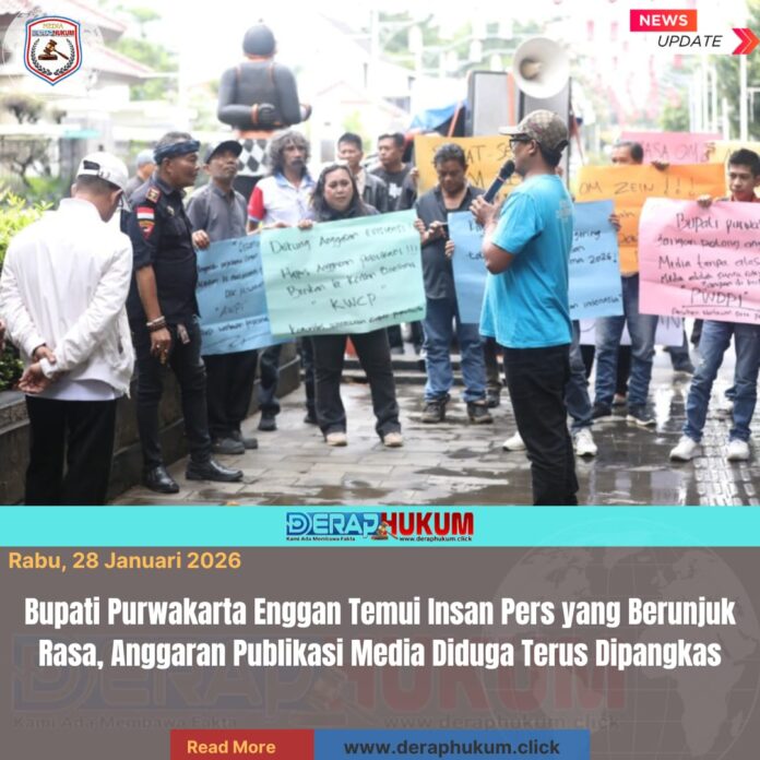 Kabupaten Purwakarta, Jawa Barat | Deraphukum.click | Puluhan insan pers yang tergabung dalam Presidium Organisasi Media dan Kelompok Kerja (Pokja) Wartawan Kabupaten Purwakarta menggelar aksi unjuk rasa, Rabu (28/1/2026). Aksi tersebut menyasar Kompleks Pemerintah Daerah, Kantor Diskominfo, serta DPRD Purwakarta.