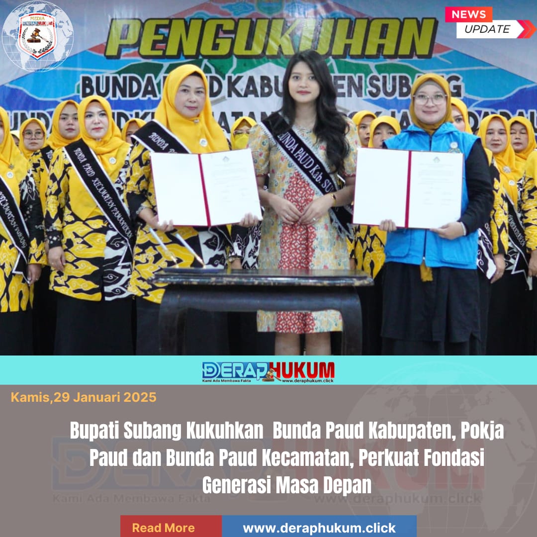Subang,Jawa Barat l Deraphukum.click l Bupati Subang Reynaldy Putra Andita B R, S.IP. mengukuhkan Bunda PAUD Kabupaten Subang, yang diikuti oleh pengukuhan Pokja PAUD Kabupaten Subang, serta Bunda PAUD Kecamatan se-Kabupaten Subang oleh Bunda PAUD Kabupaten Subang, Ega Anjani Reynaldy, S.IP., dalam sebuah rangkaian seremoni yang berlangsung di Aula Pemda Subang, Kamis (29/1/2026).