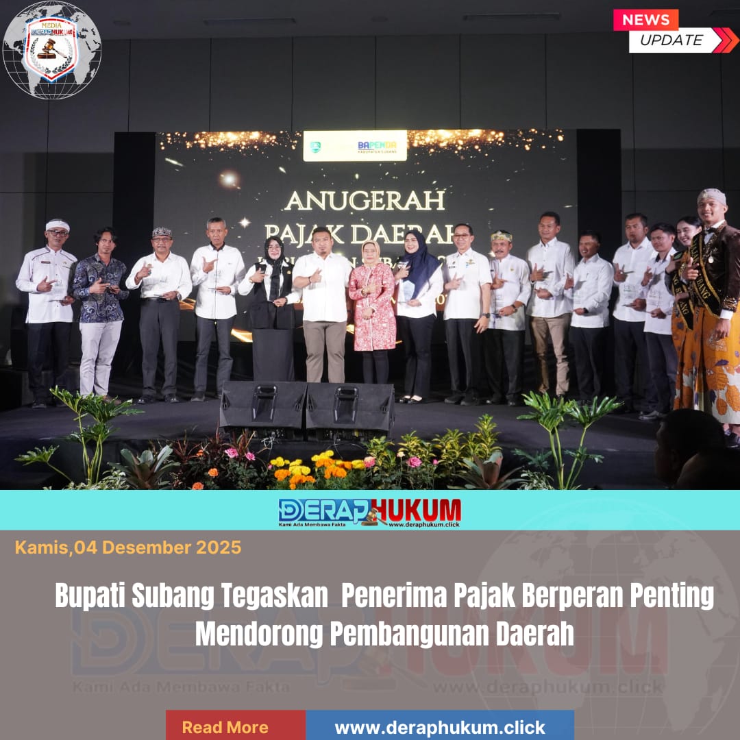Subang,Jawa Barat l Deraphukum.Click l Bupati Subang Reynaldy Putra Andita Budi Raemi hadir bersama Sekretaris Daerah untuk menyerahkan langsung penghargaan dan menyampaikan arah kebijakan fiskal Subang pada Anugerah Pajak Daerah Tahun 2025 di Ballroom Sawala Ageung, Laska Hotel Subang, Rabu (3/12/2025).
