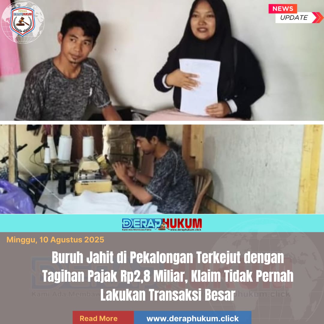 Pekalongan,Jawa Tengah | Deraphukum.click | Indonesia investigasi. com – ( 9/8/2025 ),Ismanto (32) dan Ulfa (27), buruh jahit harian lepas asal Desa Coprayan, Kecamatan Buaran, Kabupaten Pekalongan, Jawa Tengah, kaget menerima tagihan pajak Rp2,8 miliar.
