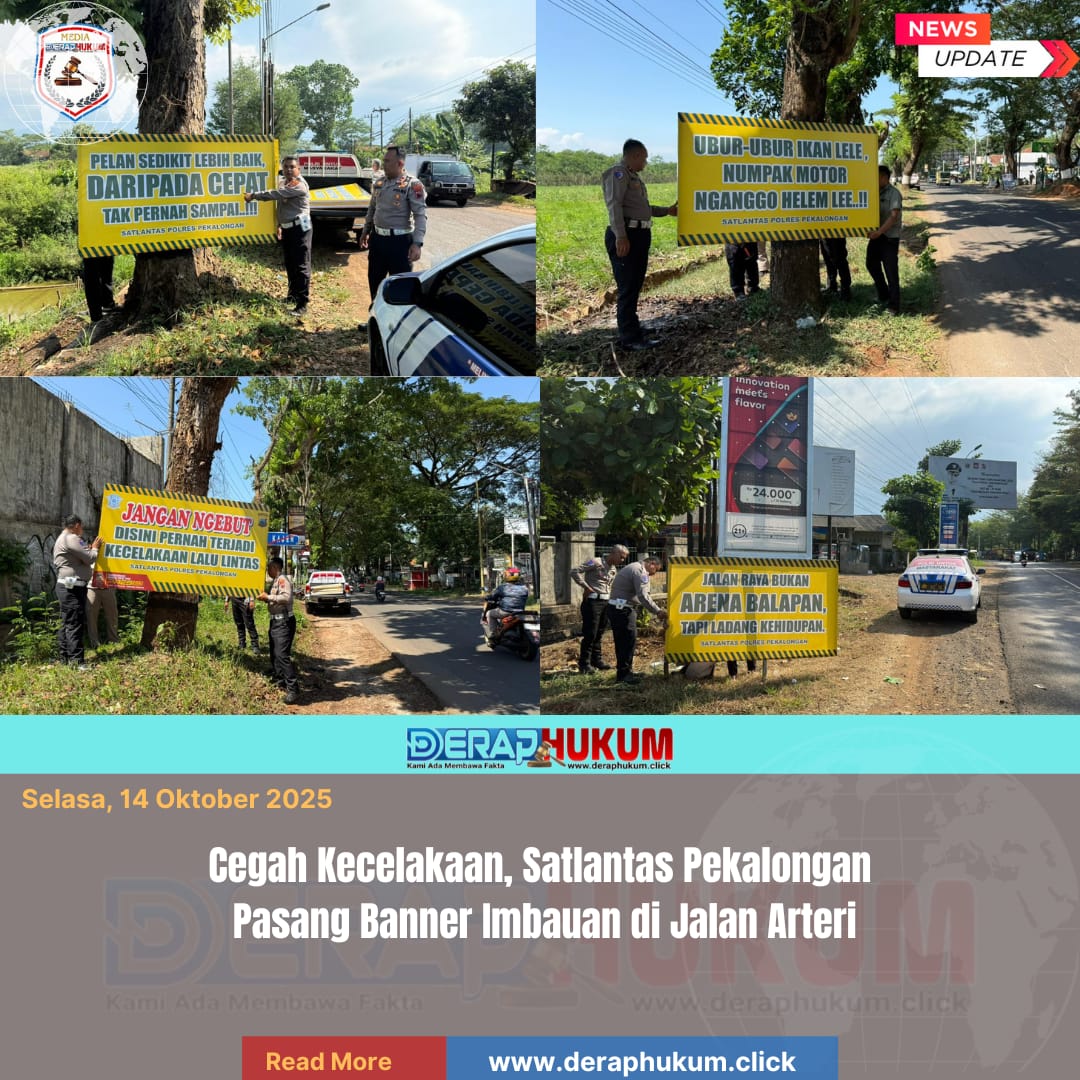 Pekalongan,Jawa Tengah | Deraphukum.click | Polres Pekalongan – Polda Jateng – Satlantas Polres Pekalongan melakukan pemasangan banner imbauan rawan kecelakaan lalu lintas (laka lantas) di jalur arteri wilayah Kabupaten Pekalongan. Kegiatan ini digelar pada Senin (13/10/2025) pagi di Jalan Pahlawan Gejlig, Kajen, yang merupakan salah satu titik rawan kecelakaan di daerah tersebut.