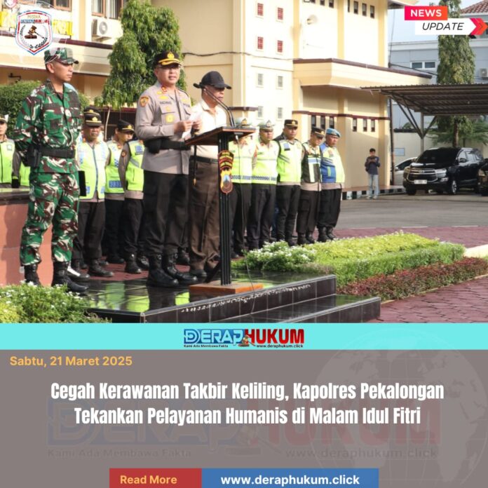 Pekalongan,Jawa Tengah | Deraphukum.click | Polres Pekalongan – Polda Jateng – Polres Pekalongan menggelar Apel Pengamanan Malam Takbiran Hari Raya Idul Fitri 1447 H di halaman Mapolres Pekalongan, Jumat (20/03/2026) sore. Apel ini menjadi penegasan kesiapan personel gabungan dalam menjaga kondusifitas wilayah pada malam Idul Fitri.