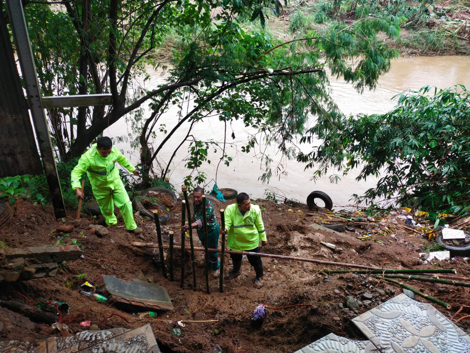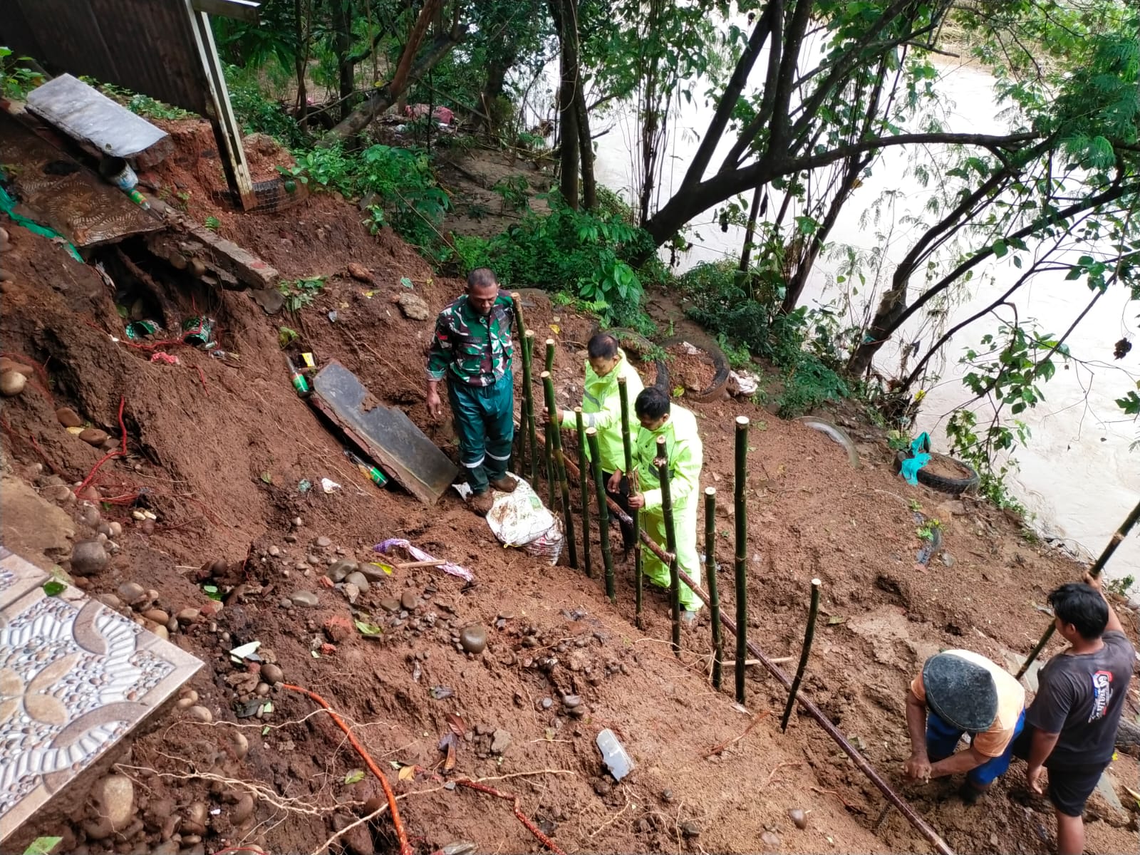 “Hari ini kami bersama rekan-rekan TNI dari Koramil, Pemerintah Desa, dan warga setempat melaksanakan pembuatan tanggul sementara. Area ini terdampak longsor pada Rabu pekan lalu, sehingga jika tidak segera kita tanggul menggunakan karung pasir dan cerucuk bambu, dikhawatirkan abrasi sungai akan semakin mendekati pemukiman warga,” ujarnya.