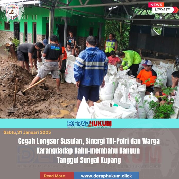 Pekalongan,Jawa Tengah | Deraphukum.click | Polres Pekalongan – Polda Jateng – Personil gabungan dari Polsek Karangdadap, TNI, bersama warga Desa Pangkah menunjukkan aksi nyata kepedulian lingkungan. Mereka turun langsung ke aliran Sungai Kupang di Dukuh Kebondalem untuk membangun tanggul darurat sepanjang 15 meter guna mengantisipasi ancaman longsor yang lebih luas, Jumat (30/01/2026) pagi.