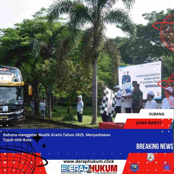 SUBANG, | Deraphukum.click | PT DAHANA kembali menggelar Mudik Gratis untuk masyarakat yang akan bertemu keluarga di kampung halaman saat menjelang Hari Raya Idul Fitri 1446 H. Peserta mudik gratis DAHANA rencananya akan berangkat dari Bale DAHANA Subang, Gelora Bung Karno Jakarta dan Gedung Sate Bandung pada Kamis, 27/2/ 2025.