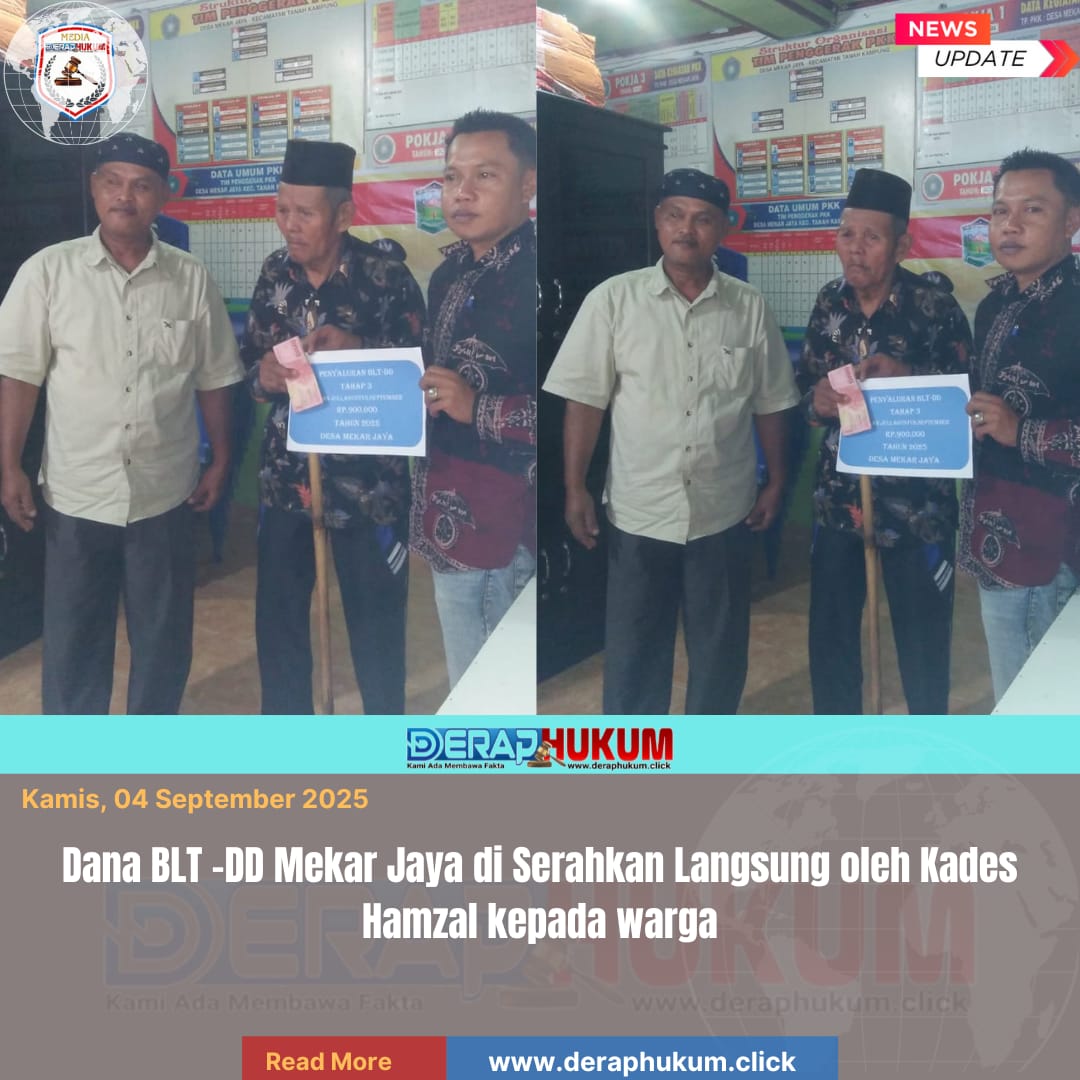 Sungai Penuh, | Deraphukum.click | Pada hari kamis 3/9 2025, telah dilaksanakan kegiatan Penyaluran Bantuan Langsung Tunai Dana Desa (BLT-DD) untuk bulan Juli Tahun 2025 yang bertempat di Desa Mekar Jaya Tanah Kampung