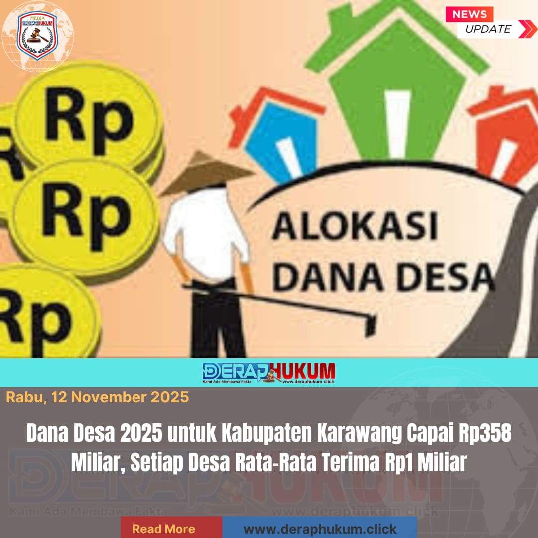 Karawang, Jawa Barat | DerapHukum.click | Pemerintah Pusat telah resmi menetapkan pagu anggaran Dana Desa Tahun 2025 untuk Kabupaten Karawang sebesar Rp358.978.734.000. Dana tersebut akan disalurkan kepada 297 desa yang tersebar di 30 kecamatan, dengan rata-rata alokasi sekitar Rp1 miliar per desa.