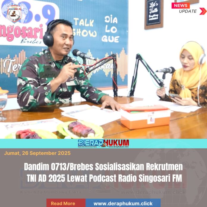 Brebes,Jawa Tengah | Deraphukum.click | Komandan Kodim 0713/Brebes, Letkol Inf Sapto Broto, menggelar sosialisasi penerimaan prajurit TNI Angkatan Darat (TNI AD) Tahun 2025 melalui podcast bertajuk “Sosialisasi Penerimaan Prajurit TNI AD Tahun 2025” yang disiarkan langsung di Radio Singosari FM, Kecamatan Brebes, Kabupaten Brebes, Jumat (26/9/2025).