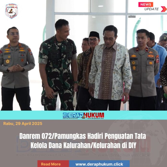 Yogyakarta, | Deraphukum.click | Komandan Korem (Danrem) 072/Pamungkas Brigjen TNI Yuniar Dwi Hantono, S.Sos., M.Si., M.Sc., menghadiri kegiatan Laku Sasmita Amrih Nirmala dalam rangka penguatan pengelolaan dana kalurahan/kelurahan yang transparan, akuntabel, dan bebas dari praktik korupsi bertempat di Taman Budaya Embung, Giwangan, Umbulharjo, Kota Yogyakarta, Selasa (28/4/2026).