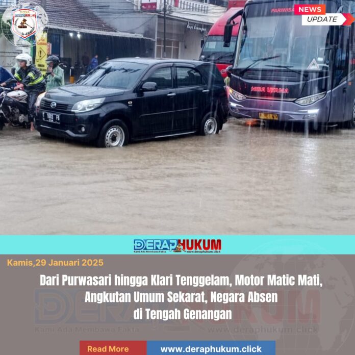Karawang,Jawa Barat | Deraphukum.click | Hujan belum seberapa lama turun, namun lumpuhnya urat nadi ekonomi Karawang kembali terulang. Sepanjang jalan raya nasional dari Purwasari hingga Klari berubah menjadi sungai darurat, memaksa kendaraan roda dua, angkutan umum, hingga bus pariwisata berjibaku melawan genangan air setinggi betis hingga hampir mencapai mesin kendaraan.