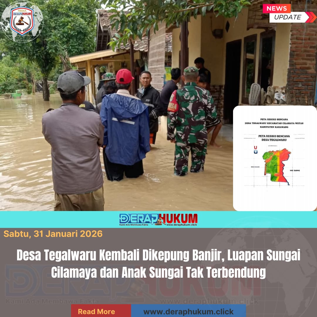 Karawang, Jawa Barat | Deraphukum.click | Desa Tegalwaru, Kecamatan Cilamaya Wetan, Kabupaten Karawang, menjadi salah satu wilayah yang kembali terdampak banjir akibat luapan Sungai Cilamaya. Desa ini berada di wilayah hilir Sungai Cilamaya, sehingga sangat rentan terdampak ketika debit air sungai meningkat.