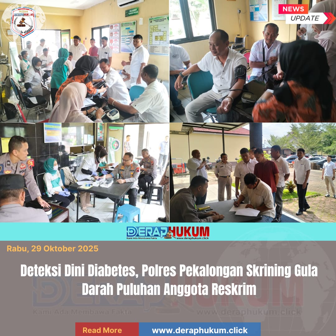 Pekalongan,Jawa Tengah | Deraphukum.click | Polres Pekalongan – Polda Jateng – Sie Dokkes Polres Pekalongan gencar melakukan upaya deteksi dini penyakit kronis di kalangan anggotanya. Sebanyak 41 personel Satuan Reserse Kriminal (Sat Reskrim) Polres Pekalongan menjalani pemeriksaan atau skrining gula darah (Diabetes Melitus/DM) pada Rabu (29/10/2025).