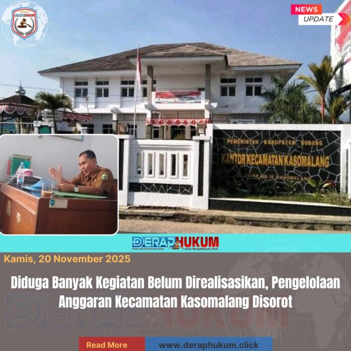 Subang, Jawa Barat | DerapHukum.click | Pengelolaan anggaran Biaya Operasional Pemerintahan (BOP) tahun anggaran 2025 di Kecamatan Kasomalang, Kabupaten Subang, mendapat sorotan tajam. Sejumlah kegiatan yang tercantum dalam daftar anggaran disebut-sebut belum direalisasikan hingga memasuki akhir tahun, sehingga menimbulkan tanda tanya di kalangan masyarakat dan awak media.