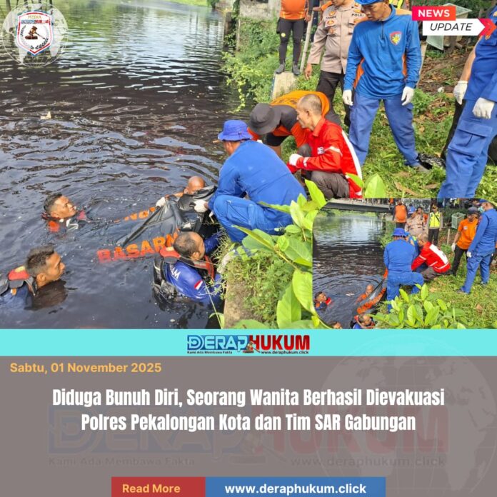 Pekalongan Kota, | Deraphukum.click | Polres Pekalongan Kota – Polda Jateng – Tim SAR gabungan dari Polres Pekalongan Kota, Basarnas, BPBD, dan SAR Arnavat Polres Pekalongan Kota berhasil mengevakuasi seorang wanita yang diduga melakukan bunuh diri di Jembatan Sungai (Kali) Loji, Kecamatan Pekalongan Timur, Kota Pekalongan, pada Sabtu (1/11/2025) pagi.
